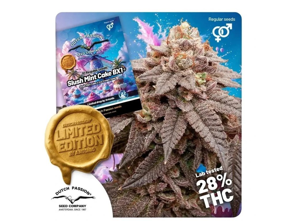 Slush Mint Cake BX1 je regulérní verze hybridu s výjimečným obsahem THC (až 28 %), vytvořená křížením Slush Mint Cake (In House Genetics) a Ice Cream Cake. Tato odrůda vyniká hustými, lepkavými a silně ojíněnými palicemi bohatými na trichomy a mimořádně intenzivním terpenovým profilem.